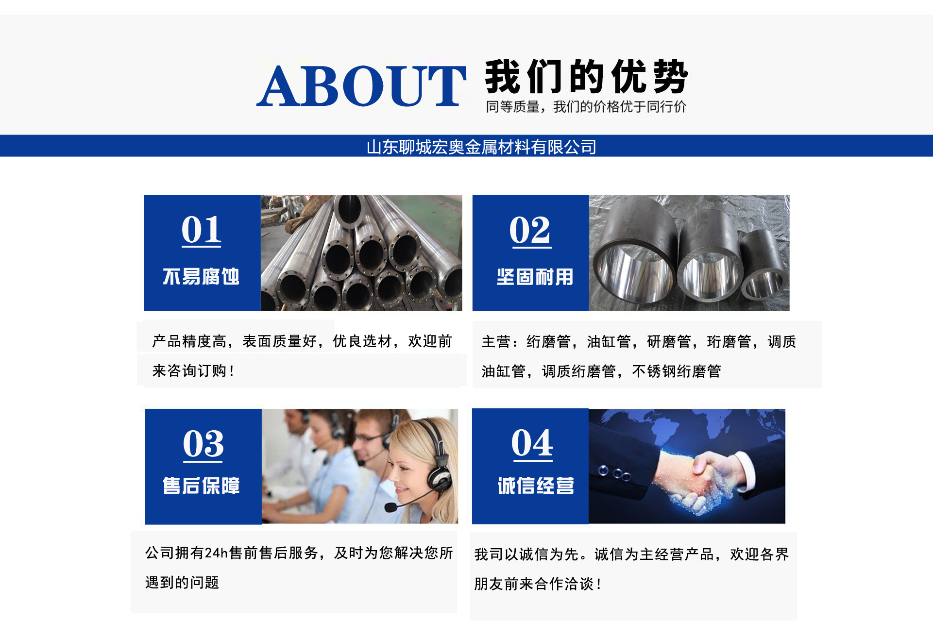 山東聊城宏奧金屬材料有限公司位于風景秀麗的江北水城-聊城。地理位置優(yōu)越,交通便利。主營絎磨管,油缸管,研磨管,珩磨管,調質油缸管,調質絎磨管,不銹鋼絎磨管等產品 廣泛應用于礦山、起重、船舶、煤炭、運輸、化工、科研、軍工等工業領域。 公司憑借雄厚的實力,豐富齊全的規(guī)格品種,完善的質量保證,合理的價格,優(yōu)質的服務,不斷地受到新老用戶及業內人士的肯定和信任,我們本著及用戶之所及,想用戶之所想的服務宗旨不斷地拼搏,進取,在此對多年來支持我們的各行各業的新老朋友表示由衷的感謝,愿我們今后的合作更加愉快! 歡迎國內外新老客戶來公司視察、蒞臨指導工作!...